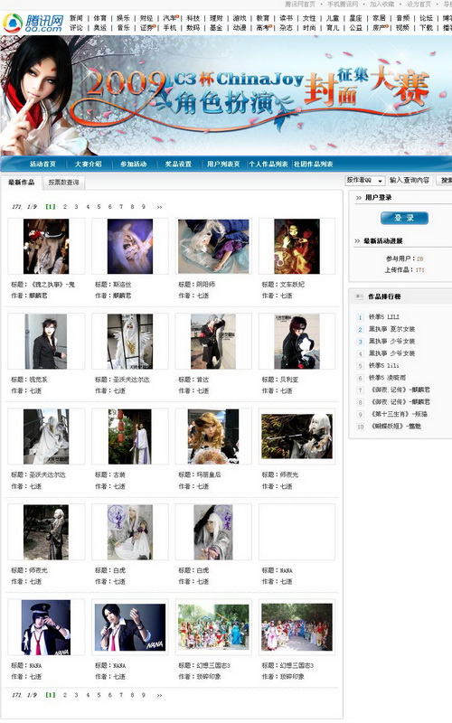 2009 “C3杯”ChinaJoy Cover Coser封面征集大赛全新的比赛系统将为广大选手参赛提供更大的便利,每个QQ号上传作品数量限制从20张提高到了30张,页面开放第一天已收到近200副作品参赛!不要吝惜你们的热情,来将比赛点燃吧!