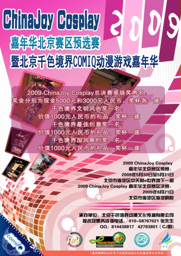 2009 ChinaJoy Cosplay 嘉年华北京赛区预选赛暨首届北京千色境界COMIQ动漫游戏嘉年华将于2009年5月30日、5月31日在中关村E世界进行预赛选拔,并于一个月后的6月21日在海淀剧院举行最终王者争霸,甄选出2支晋级队伍直通上海,参加2009 ChinaJoy Cosplay嘉年华全国总决赛。