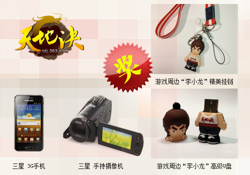 2.所有参与投票的用户,都有机会参与抽奖活动,奖品包括数码奖品三星(SAMSUNG)I8530 3G手机和三星(Samsung)HMX-F80,以及精美的天地决游戏周边“李小龙”精美挂链、游戏周边“李小龙”高级U盘。