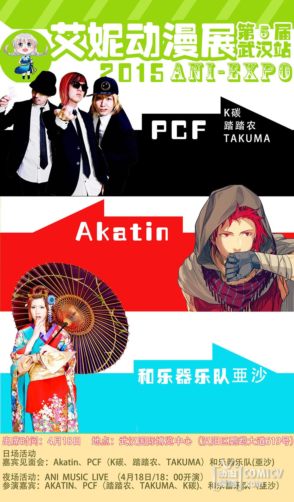 日方实力派唱见AKATIN;将与NICONICO当红舞团PCF主力成员TAKUMA、K碳、踏踏农一同出席艾妮动漫展4月18日的见面会;夜场会与和乐器乐队的?沙一起在艾妮动漫音乐会(ANI MUSIC LIVE)上为大家带来精彩的演出!与你们一起燃爆国博!