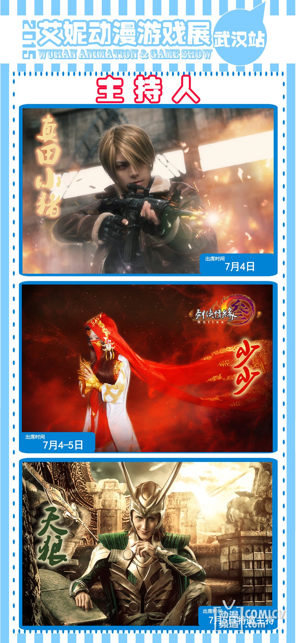 第七届艾妮动漫展将于7月4-6日武汉国际博览中心举办,本届动漫展邀请了多位知名人气嘉宾:杭州304社团天水三千&天水寻、宝岛台湾人气coser King狂间、著名多元化专业coser 十夜TOOYA、知名动漫展会主持人天狼、 国内人气coser 一之濑光,当然少不了我们的好朋友真田小猪以及少少。