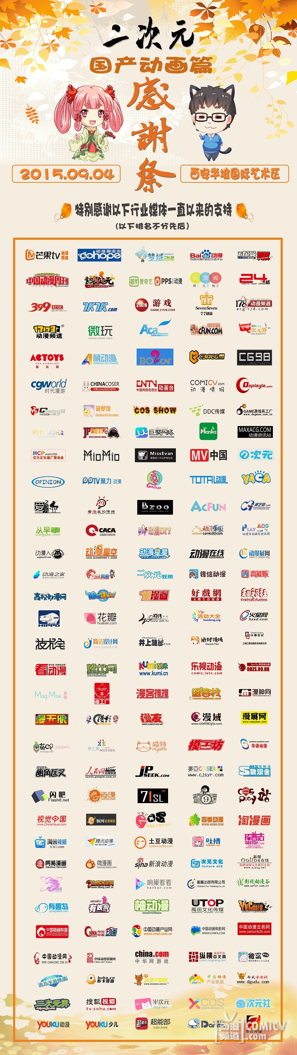 西安二次元感谢祭——感谢一直为我们奉献精彩作品的全体动画人,感谢一路以来支持我们的所有朋友们,这是以“感恩”为主题的一个二次元系列活动企划,第一期,特别感谢国产动画!本场主题由二次元小窝(@动漫媒体人小胖)、西安动漫社团联盟特别企划,西安收听第一台988陕西音乐广播联合主办。