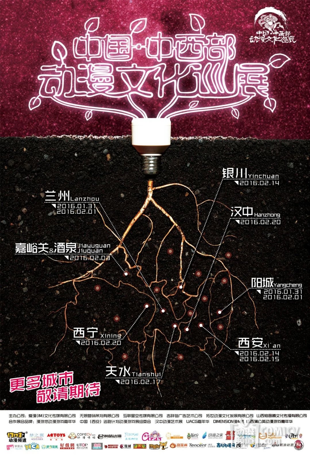 本次巡展计划时间从2016年1月31日至2月20日期间,从第一站兰州开始呈辐射状扩散至西北五省九市开展巡展活动。巡展举办城市有甘肃省:兰州-2016年1.31-2.1(兰州市城关区西关十字伊和园礼宴中心五楼)、天水2016年2.17(天水南站体育场室内场)、酒泉&嘉峪关2016年2.3(酒泉生态文化博览园二楼演艺大厅);宁夏回族自治区:银川2016年2.14(银川市银川国际会展中心);青海省:西宁2016年2.20(青海省西宁市城东区八一路41号蕴园);陕西省:西安2016年2.14-2.15(地点待定)、汉中2016年2.??(陕西省汉中市滨江路茶城广场主楼六层展厅);还有新加入的来自山西的主办城市阳城2016年1.31-2.1(地点待定)。九场展会,一场旅城,最好的动漫文化,最好的城市奉献给你。
