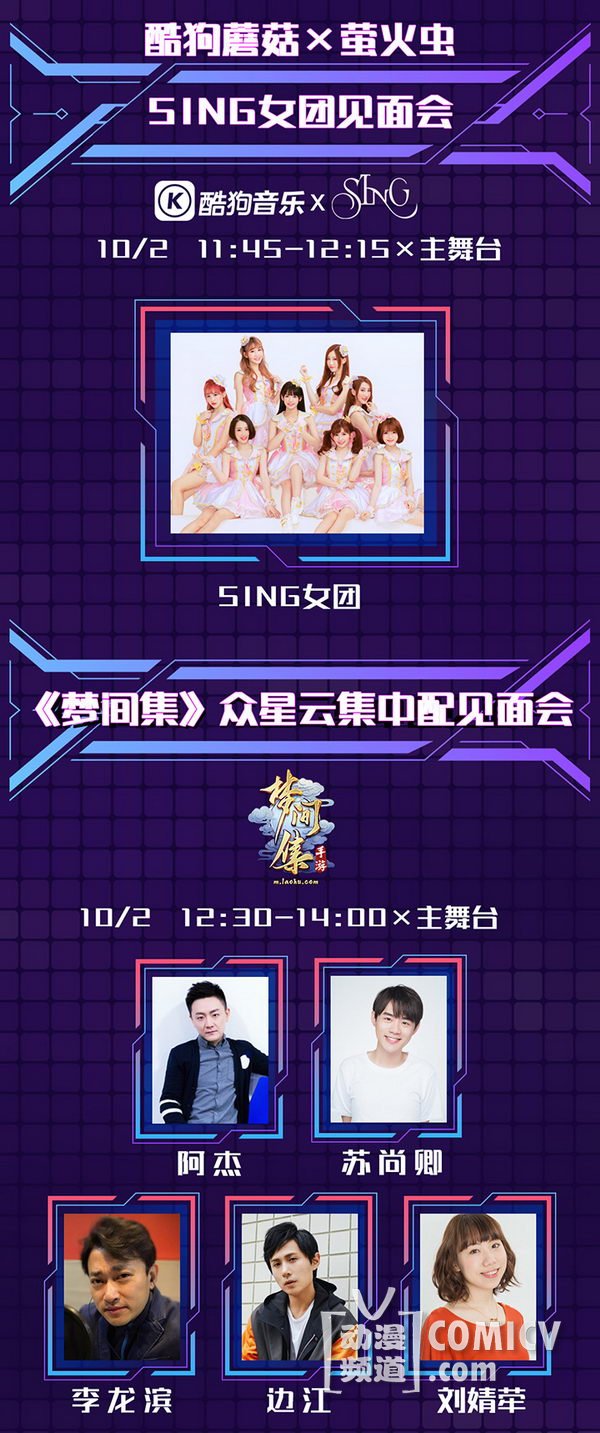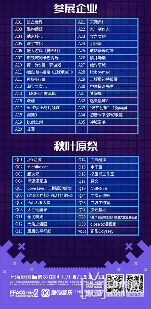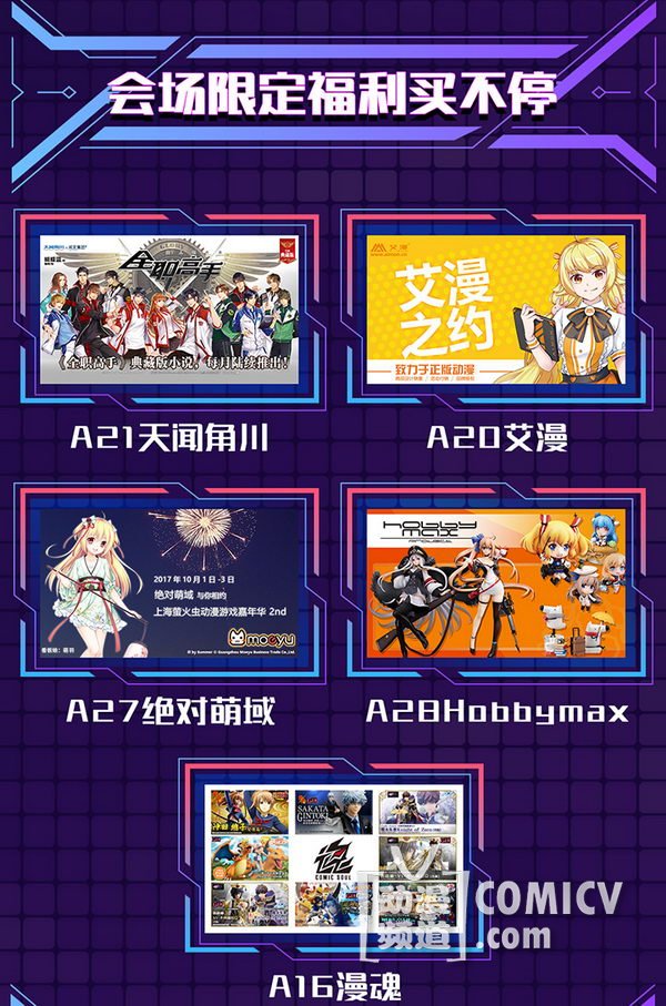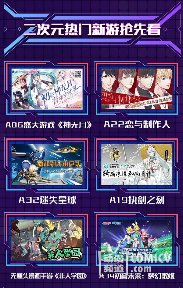 天闻角川,海岸线工作室-《纳米核心》,艾漫,Hobbymax,七创社-《凹凸世界》,Vsinger ,网易游戏-《魔法禁书目录(正版手游)》、阴阳师、神都夜行录、非人学园,盛大游戏-《神无月》、《神域召唤》,腾讯游戏-《初音未来:梦幻歌姬》,西山居-剑网3重制版、梦间集等诸多实力动漫游戏厂商加盟!