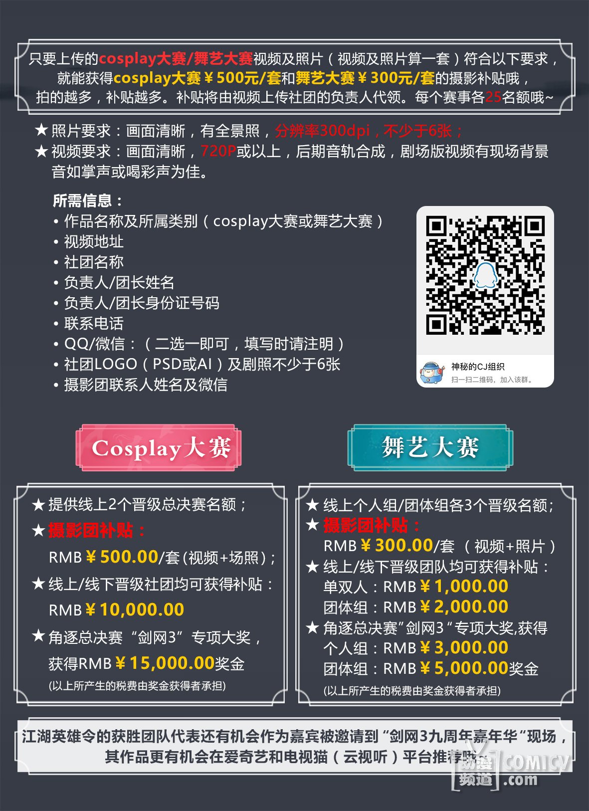 最后再此提醒大家(敲黑板,划重点):视频上传成功后,以便主办方与参赛社团联系,请扫码参加神秘的CJ组织官方QQ群。然后按照上面图中的要求将内容将资料发送至QQ群内工作人员QQ或者邮箱:2853281011@qq.com。等工作人员确认之后,即可参与成功!不发资料的同学是没办法成功报名的!!!请大家奔走相告!官方表示很期待你们福利拿到手软哟!~