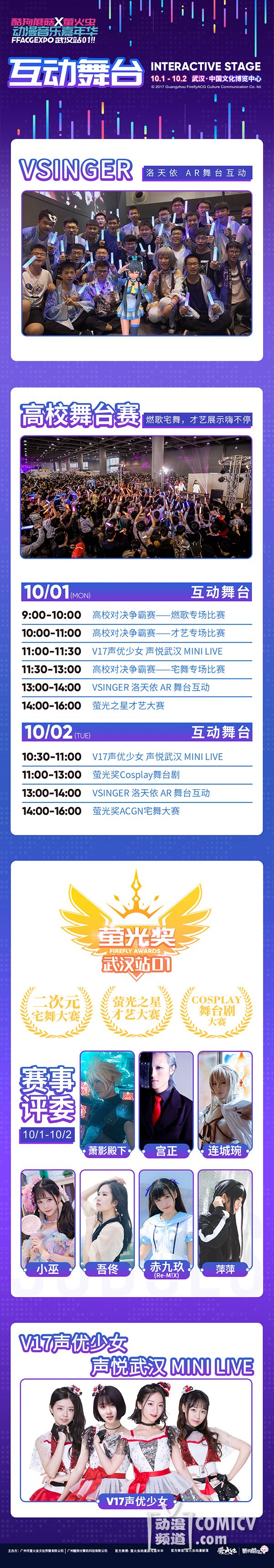 互动舞台精彩活动同样不容错过!四大活动版块!VSINGER洛天依 AR互动!V17少女空灵之音只为你而唱响!萤光之星才艺大赛!高校对决争霸赛!一起来嗨翻天吧~